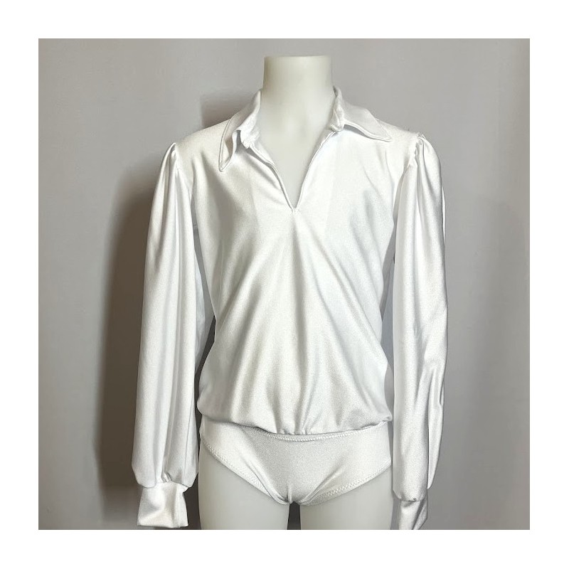 Chemise de danseur en lycra brillant blanc, montée sur panty fermé à l'entrejambe par des crochets.